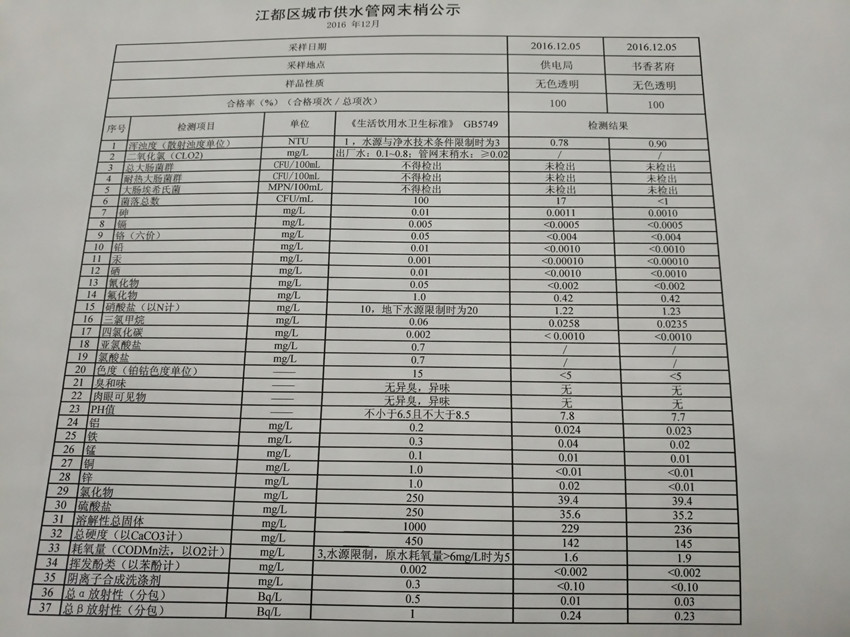 2016年12月江都區城市供水管網末梢公示