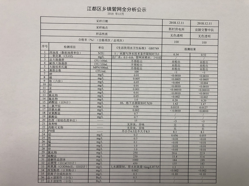 2018年12月江都區(qū)鄉(xiāng)鎮(zhèn)管網(wǎng)全分析公示