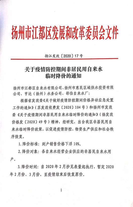 關(guān)于疫情防控期間非居民用自來(lái)水臨時(shí)降價(jià)的通知